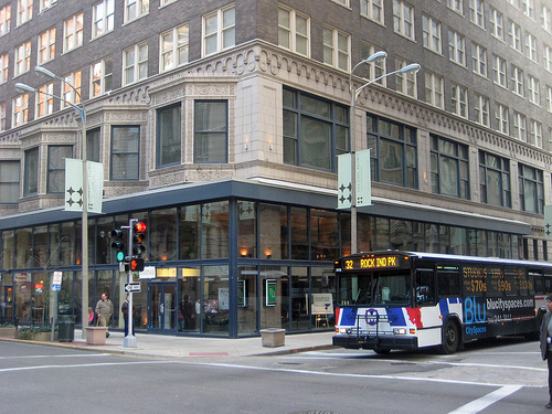 This photo was taken in March of 2009 at 9th and Olive. The Building pictured is the Paul Brown Building. Notice the green sign on building’s first floor is no longer there. The main giveaway that this photo is at least 10 years old is the MetroBus #32 heading north on 9th. That bus and many others ceased to run east of the Tucker that same month in as part of a service reduction that turned out to be temporary. Interestingly, that route used to stretch northwest all the way from downtown to Rock Industrial Park Drive in Earth City. What a haul!